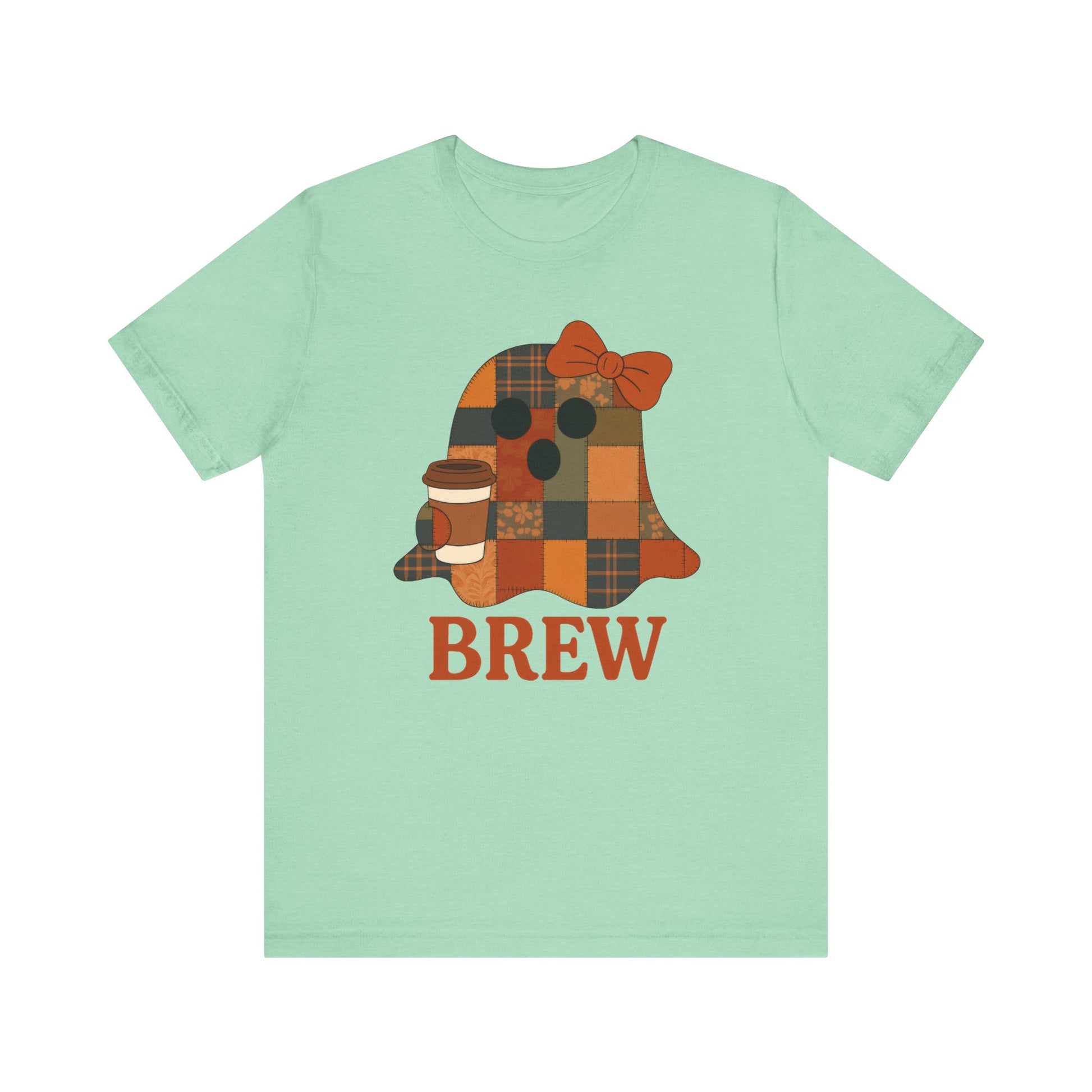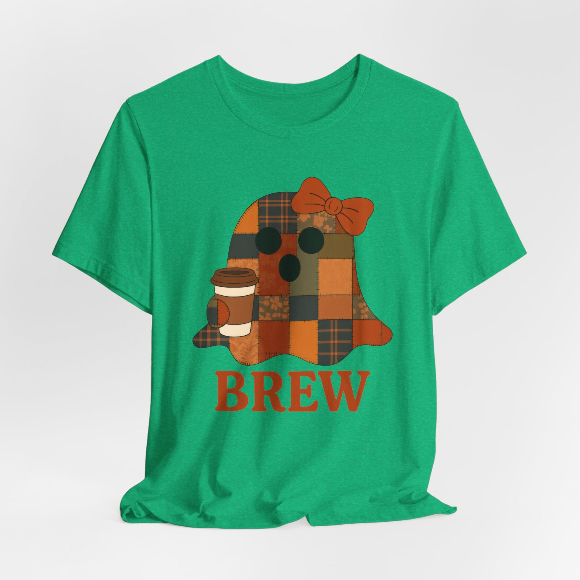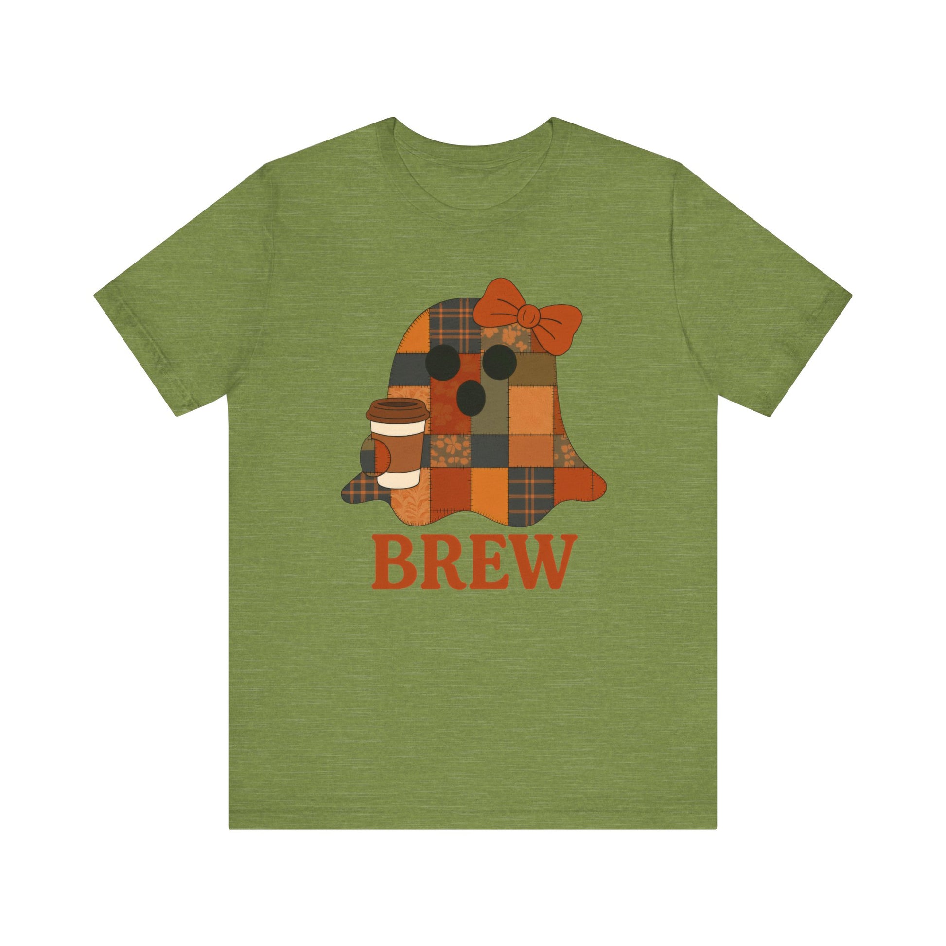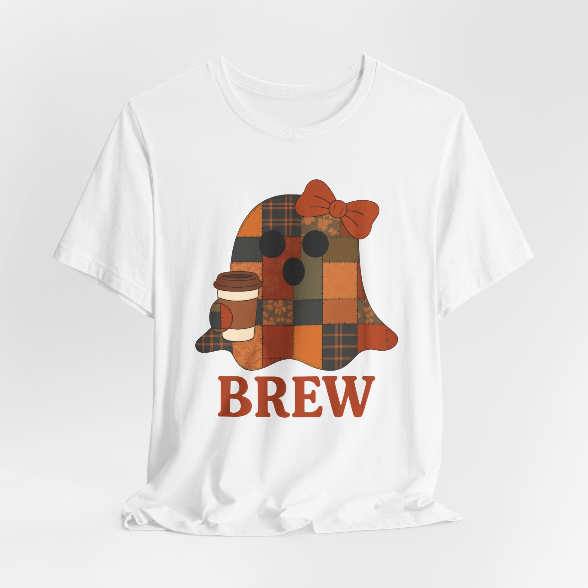 Patchwork Ghost Coffee Halloween Shirt – Quilted Fall Plaid Brew Tee for Coffee Lovers